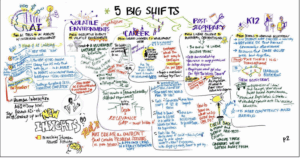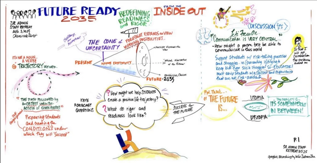 In August, the Keys Leadership Team stepped away from our campuses for a two and a half day off-site retreat to imagine the future our students will inherit – a future defined by exponential technological change and deep uncertainty. We gathered with education futurist Andrea Saveri, whose work helps educational leaders use “strategic foresight” to anticipate the forces shaping the decade ahead. We were fortunate also to have the talented Graphic Recorder, Leslie Salmon-Zhu, present to visually record our discussion as seen in the images below. Our goal was not to predict the future but to prepare for it – to ask what will truly matter for our students during a time when artificial intelligence is transforming how we live, work, and learn.