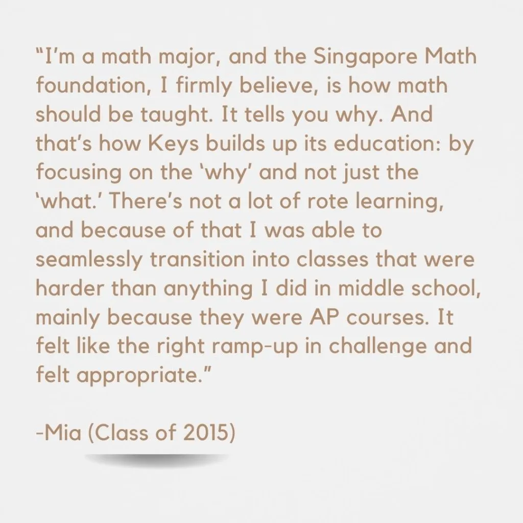 “I’m a math major, and the Singapore Math foundation, I firmly believe, is how math should be taught. It tells you why. And that’s how Keys builds up its education: by focusing on the ‘why’ and not just the ‘what.’ There’s not a lot of rote learning, and because of that I was able to seamlessly transition into classes that were harder than anything I did in middle school, mainly because they were AP courses. It felt like the right ramp-up in challenge and felt appropriate.”