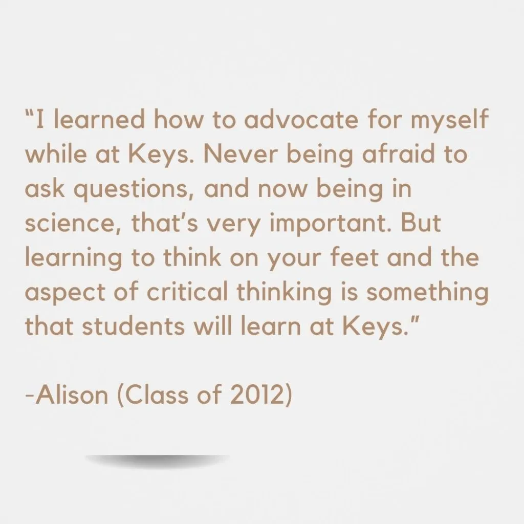 “I learned how to advocate for myself while at Keys. Never being afraid to ask questions, and now being in science, that’s very important. But learning to think on your feet and the aspect of critical thinking is something that students will learn at Keys.”